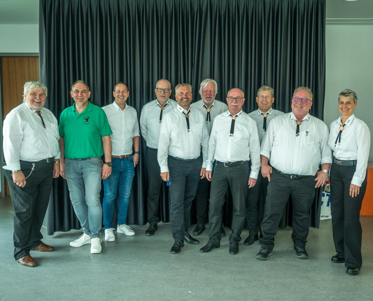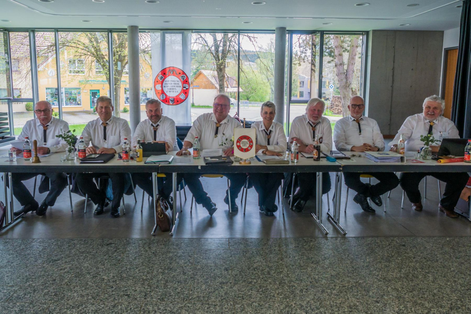 Im Bild von links nach rechts: Kanzellar Jochen Große, neu gewählter Braumtumsmeister Reiner Micheler, neu gewählter Pressereferent Daniel Dangelmaier, Säckelmeister Harry Vojta, Vizepräsident Jochen Fundel, der scheidende Pressereferent Uwe Seiferth, Präsident Reinhard Siegle, Vizepräsident Jörg Ritter, der scheidende Brauchtumsmeister Elmar Herter, Jugendvertreterin Nadine Wassmer.