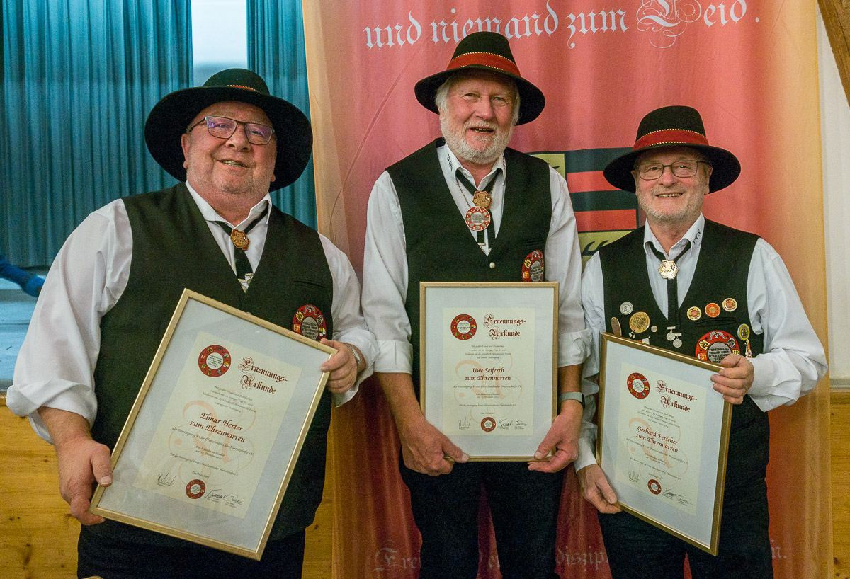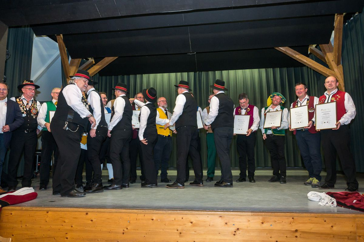 Ein weiterer Höhepunkt des Tages war die Ernennung unseres ehem. Brauchtumsmeisters Elmar Herter, Hayingen, und unseres ehem. Pressereferenten Uwe Seiferth, Grossengstingen, zu Ehrennarren unserer Vereinigung. In seiner Laudatio für die beiden Erznarren hob Präsident Reinhard Siegle die zahlreichen Verdienste der beiden hervor.